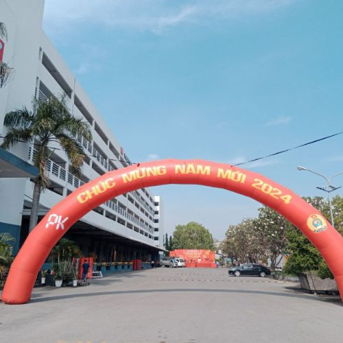 Cổng hơi cho thuê được làm từ chất liệu vải polyester phủ PVC hoặc nhựa PVC 2 lớp tăng cường, giúp sản phẩm có độ bền cao, chống thấm nước và chịu được tác động của môi trường. Các đường may được gia cố kỹ lưỡng để đảm bảo không bị xì hơi.